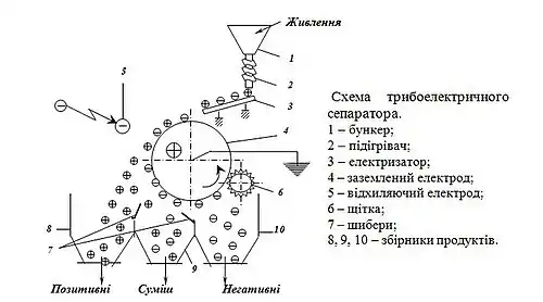 При електростатичній сепарації розділення проводиться у електростатичному полі, частинки заряджаються контактним або індукційним способом. Розділення за електропровідністю відбувається при зіткненні частинок з електродом (наприклад, зарядженою поверхнею барабана; електропровідні частинки при цьому отримують однойменний заряд і відштовхуються від барабана, а неелектропровідні не заряджаються). Утворення різнойменних зарядів можливе при розпиленні, ударі або терті частинок об поверхню апарата (трибоелектростатична сепарація). Вибіркова поляризація компонентів суміші можлива при контакті нагрітих частинок з холодною поверхнею зарядженого барабана (піроелектрична сепарація).