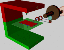 потужності на електроенергію, однакові. Механічна потужність подається на генератор у вигляді обертання механічного валу. Перетворення засновано на силі Лоренца, яка діє на рухомі електричні заряди у магнітному полі. Якщо провідник рухається поперек (перпендикулярно) до магнітного поля, сила Лоренца діє на заряди у провіднику у напрямку цього провідника і, таким чином, приводить їх у рух. Цей зсув заряду, викликає різницю потенціалів і генерує електричну напругу між кінцями провідника. У суміжній анімації має значення лише зміщення провідника (або двох відповідних секцій котушки) перпендикулярного магнітному полю. Це показується червоною областю. Чим більше змінюється площа за час зміни, тим вище напруга. Для збільшення напруги використовуються кілька провідників, з'єднаних послідовно у вигляді котушки.