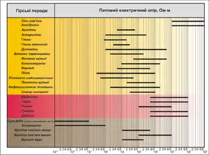 Гірські породи (Г.п.) здебільшого є напівпровідниками, частина їх — діелектрики. В таблиці нижче подано питомий електричний опір rп деяких г.п. та відносну діелектричну проникність (ε) деяких г.п.