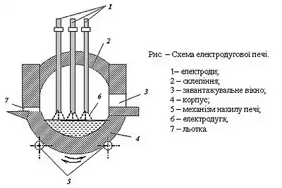 Електродугова піч складається зі сталевого кожуха, який зсередини футерований вогнетривким матеріалом. У склепінні печі є отвори для трьох електродів (піч використовує трифазний струм). Електроди діаметром понад 550 мм бувають графітові або вугільні. Дно печі — чашоподібне. В стінках печі є завантажувальне вікно і випускний отвір зі зливним жолобом.