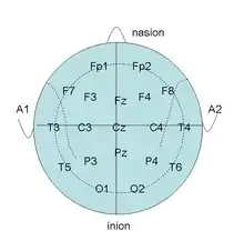 Схема розташування електродів на поверхні голови називається монтаж. У клінічній та науковій електроенцефалографії стандартом є схема «10-20 %», яку було введено у 1950-х роках канадським нейрофізіологом Генрі Джаспером. Для визначення місць накладання електродів через маківку (Vertex) проводяться два умовні меридіани — перший від перенісся (Nasion) до потиличного бугра (Inion), другий між зовнішніми слуховими проходами (див. схеми нижче). Через ці точки прокладають умовний меридіан, який діляться на відрізки по 10 і 20 % загальної довжини. Поперечні меридіани відкладаються по осі, яка проходить між зовнішніми слуховими проходами через маківку. Електроди розміщуються у місцях перетину умовних ліній. Електроди, які розміщуються на лівій стороні голови, мають непарні індекси; на правій стороні — парні; електроди, розміщені на вертексній лінії, мають індекс z. Чим менше індекс електрода, тим ближче він розташований до основних меридіанів. Позначення електродів: F (Frontalis) — лобні; T (Temporalis) — скроневі; C (Centralis) — центральні; P (Parientalis) — тім'яні; O (Occipitalis) — потиличні; А (Auricularis) — вушні. Кількість накладених електродів залежить від конкретної мети дослідження. В разі необхідності схему 10-20 % можна розширити шляхом проведення додаткових меридіанів між основними. Стандартизація схеми накладання електродів дозволяє дослідникам та лікарям зіставляти результати, отримані в різний час у різних лабораторіях. Для реєстрації ЕЕГ необхідна наявність двох електродів, між якими і буде вимірюватися різниця електричних процесів. Пара електродів, між якими реєструється різниця потенціалів, називається відведенням.
