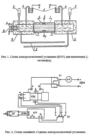 Схема установки для електростатичних досліджень показана на рис. 1. Установка дозволяє визначати величину осмотичного переміщення рідини, її питому електропровідність і поверхневу провідність порошкової діафрагми. Електроосмотична установка (ЕОУ) виконана з органічного скла та містить такі елементи: 1 — знімна склянка для досліджуваного порошку; 2 — бічні камери; 3 — градуйовані капіляри; 4 — електролітичні агарові ключі; 5 — допоміжні бюретки; 6 — платинові плоскі електроди; 7 — знімні фільтри; 8 — платинові стрижневі електроди; 9 — електролітичні судини з мідними електродами. Електрична схема зовнішніх з'єднань ЕОУ представлена на рис. 2. Для зміни напрямку електроосмотичного переносу рідини слугує перемикач T1, контроль струму здійснюється міліамперметром із межами вимірювань 0—10 мА. Визначення електропровідності розчину (v) і поверхневої провідності діафрагми (s) здійснюється за допомогою електродів (8) і (6), вимірювального моста (ВМ) і генератора (ЗГ), що працює на частоті 1000 Гц. Методика вимірювань дзета-потенціалу. Досліджуваний вугільний порошок вузького класу крупності 50—100 мкм приводиться до необхідного ступеня сорбційної рівноваги з рідкою фазою визначеного йонного складу. У вологому стані проба вугілля поміщається в знімну склянку (1), один торець якої закритий фільтром (7), і ущільнюється вібраційним впливом до заповнення. Закрита другим фільтром склянка з отриманою діафрагмою затискається між бічними камерами (2), після чого установка через бюретки (5) заповнюється бічною рідиною до повного витиснення повітряних порожнин. За допомогою кранів бюреток виставляються меніски горизонтальних капілярів на нульові позначки. Від джерела постійного струму через електролітичні ключі подається напруга і фіксується час початку електроосмотичного переносу (ЕОП).