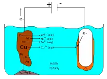 Наприклад, нормальний електродний потенціал Cu щодо водневого електроду порівняння, прийнятого за нуль + 0,346, у Au і Ag ця величина має більше позитивне значення, а у Ni, Fe, Zn, Mn, Pb, Sn, Co нормальний електродний потенціал негативний. При електролізі мідь осідає на катоді, благородні метали, не розчиняючись, осідають на дно електролітної ванни у вигляді шламу, а метали, що володіють негативним електродним потенціалом, накопичуються в електроліті, який періодично очищають. Іноді (наприклад, в гідрометалургії Zn) використовують електролітичне рафінування з нерозчинними анодами. Основний метал знаходиться в розчині, заздалегідь ретельно очищеному від домішок, і в результаті електролізу осідає в компактному вигляді на катоді.