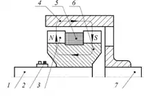 З усієї конструктивної і функціональної різноманітності поширені муфти індукторного типу з масивним якорем як найбільш прості у виготовленні й експлуатації. На рисунку 4 показано схему муфти індукторного типу з ковзними контактами, що є струмопідвідними; основними частинами якої є якір 4 й індуктор 6. Між двома рядами зубців 3 розміщена кільцева обмотка 5, живлення до якої підводять за допомогою кілець 2. Таку конструкцію називають одноіменнополюсною, тому що зубці кожного ряду мають однакову полярність. Індуктор за допомогою шліців з’єднують з ведучим валом 1, а якір закріплено на ведений вал 7. При обертанні індуктора, внаслідок механічного переміщення електромагнітів, виникає обертове магнітне поле. Взаємодія наведених в якорі вихрових струмів з обертовим магнітним полем водночас захоплює якір убік обертання індуктора. Виділимо на внутрішній поверхні якоря контури, що відповідають обрисам зубців N i S. При обертанні індуктора потокозчеплення з виділеними контурами зменшуються, і відповідно до закону електромагнітної індукції, в якорі утворюються вихрові струми. Відповідно до правила Ленца їхні напрямки повинні підтримувати значення потокозчеплення, щоб утворюваний ними магнітний потік був спрямований згідно з потоком обмотки, а механічні сили від взаємодії останнього з вихровими струмами створювали рух якоря за індуктором. Можна сказати, що на внутрішній поверхні якоря проти кожного полюса N-індуктора виникає полюс S, а проти полюса S-індуктора – полюс N на якорі. Взаємне притягання цих полюсів протилежних полярностей змушує ведений вал обертатися в сторону ведучого.