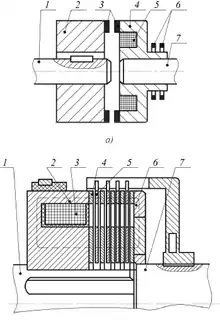 Фрикційні муфти в основному призначено для жорсткого з'єднання валів. Гнучке з'єднання за їх допомогою можливе лише через імпульсне керування, при якому частота обертання являє собою функцію скважності імпульсів напруги, що подаються на затискачі обмотки. Для фрикційних муфт, або електромеханічних муфт сухого тертя, з механічним зв'язком (рисунок 2), характерна більша різноманітність конструкцій і схем керування. На рисунку 1, а показано однодискову нереверсивну фрикційну муфту, яка складається з двох циліндричних напівмуфт. На ведучому валі 7 жорстко посаджена напівмуфта 4, яка є осердям електромагніта. Його якорем служить напівмуфта 2, яка з'єднана з веденим валом 1 посадкою ковзання і може пересуватися в осьовому напрямку. За допомогою кілець 6 та щіток на обмотку 5 подають управляючу напругу. Тягове зусилля, що утворюється, притягує якір 2 до осердя 4 і щільно притягує один до одного фрикційні диски 3 із матеріалів з високим коефіцієнтом тертя (сталь-сталь, чавун-чавун, бронза- бронза, чавун-бронза та ін.), через це і відбувається з'єднання валів.