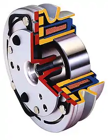 Одну з конструкцій багатодискових фрикційних муфт показано на рисунку 2 б. Фрикційні диски 4 з'єднані шліцами внутрішнього кола з ведучим валом 1, а диски 5 за допомогою шліців на зовнішньому колі — з веденим валом 7. При відключеній обмотці 3 диски 4 і 5, які чергуються, ковзають один відносно одного. Подача напруги керування забезпечує притискання дисків один до одного через притягання до осердя 2 натискної шайби 6, яка є якорем електромагніта. Виникає зєднання між дисками, необхідне для передачі заданого моменту M. Обмотку фрикційної електромагнітної муфти звичайно підключають до постійної напруги (або змінної напруги через вмонтований випрямляч), щоб використовувати переваги електромагнітів постійного струму. При відносно низьких напругах немає потреби в другому струмопровідному кільці, оскільки один із полюсів джерела живлення подають на корпус муфти.