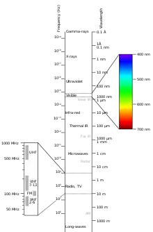 | Видиме випромінювання | 780—380 нм | 429 ТГц — 750 ТГц | ||