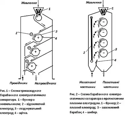 В електростатичних барабанних сепараторах (рис. 1) розділення частинок здійснюється за різницею у їх електропровідності. Процес сепарації відбувається таким чином. Вихідний матеріал з бункера 1 подається на заряджений барабан 3, що обертається. На поверхні барабану частинки провідників заряджаються швидко і в результаті взаємодії однойменних зарядів відштовхуються від барабану і падають у збірник провідників. Частинки непровідників заряджаються повільно, утримуються на барабані і знімаються щіткою 4 у власний збірник. Для збільшення кута відхилення провідників і підвищення ефективності розділення в сепаратори паралельно осаджувальним електродам 3 установлені відхиляючі електроди 2 протилежної полярності. Процес сепарації здійснюється більш успішно, якщо частинки додатково підзарядити, наприклад, за допомогою іонізації.