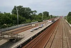 На станції одна острівна пасажирська платформа, сполучена з містом пішохідним містком. З червня 2014 обладнана чотирма турнікетами, розташованими перед сходами на пішохідний місток.