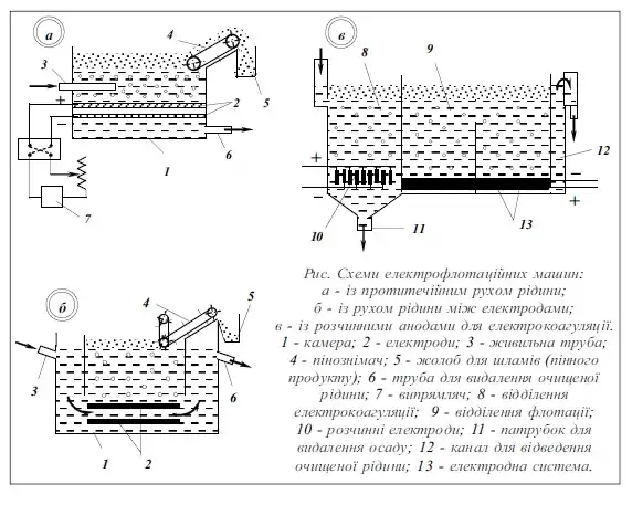Розрізняють протитечійні (бульбашки і рідина, що очищується, рухаються назустріч один одному) (рис. а), прямотечійні (рідина, що очищується пропускається між електродами) (рис. б). У випадку застосування розчинних електродів, звичайно залізних або алюмінієвих, на аноді відбувається анодний розчин металу (рис. в), у результаті чого у воду переходять катіони заліза або алюмінію, які при зустрічі з гідроксильними групами створюють різні гідроксиди, що є розповсюдженими в практиці обробки води коагулянтами. Одночасне створення пластівців коагулянту й бульбашок газу в стиснених умовах простору між електродами створює передумови для надійного закріплення газових бульбашок на пластівцях, інтенсивної коагуляції забруднюючих речовин, енергійного протікання процесів сорбції, адгезії і, як наслідок, більш ефективної флотації.