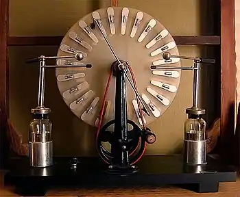 Коли A1 досягає положення навпроти сегмента B2 пластини B, котрий у цей момент контактує зі щіткою Y, він буде під високим позитивним потенціалом і, таким чином, викличе розділення заряду у провіднику, що сполучає Y та Y1, переносячи великий негативний заряд на B2 і великий позитивний заряд на віддалений сегмент, котрого у цей момент торкається щітка Y1.