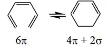 До елекроциклічних реакцій відносяться перегрупування лінійний алкенів, із спряженою системою -зв'язків, що супроводжується утворенням нового -зв'язку й замиканням циклу, а також зворотні перегрупування із розривом -зв'язку у циклічній неграничній сполуці й утвореням сполук із спряженою системою -зв'язків. Серед таких реакцій важливе місце займають 1,6-електроциклічні - шестиелектронні електроциклічні процеси. До нихвідносяться рекції циклізації гексатрієну, його похідних й гетероаналогів й розкриття циклу у циклогексадієні[1].
