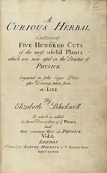 - A curious herbal: containing five hundred cuts, of the most useful plants, which are now used in the practice of physick engraved on folio copper plates, after drawings taken from the life / by Elizabeth Blackwell. To which is added a short description of ye plants and their common uses in physick. (London, 1737—1739)