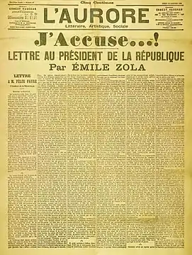 13 січня 1898 була опублікована стаття письменника «Я звинувачую» як реакція на справу Дрейфуса. Вона написана у формі відкритого листа, адресованого тодішньому президенту Французької республіки Феліксу Фору. У листі звинувачувався французький уряд в антисемітизмі та протизаконному ув'язненні Альфреда Дрейфуса. Золя наголошував на упередженості військового суду і відсутності серйозних доказів вини Дрейфуса.
