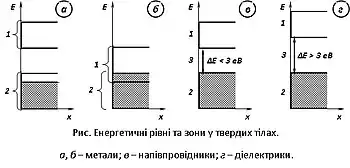 Для того щоб «звільнити» електрони і викликати електричний струм, необхідно ззовні надати їм енергію (напр., нагріти кристал). Завдяки цьому електрони будуть переведені на більш високі енергетичні рівні та складуть зону провідності (зону вільних електронів). У напівпровідниках і діелектриках між валентною зоною і зоною провідності існує проміжна — заборонена зона. Особливість цієї зони — повна відсутність дозволених рівнів. Ширина забороненої зони дорівнює величині енергії, яку необхідно надати електрону, щоб перевести його зі зв'язаного стану у валентній зоні в зону провідності. Ширина забороненої зони в напівпровідниках становить звичайно до 3 еВ, а в діелектриках, як правило, перевищує 3 еВ. Таким чином, у діелектриках і напівпровідниках валентна зона заповнена повністю, а зона провідності вільна від електронів, при цьому ширина забороненої зони в діелектриках більша, ніж у напівпровідниках (рис. 1. в, г). Валентна зона металів або не зовсім заповнена, або заповнена, але перекривається зоною провідності (рис. 1 а, б).