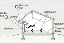 При дизайні пасивного сонячного будинку, вікна, стіни та підлоги проектуються з метою збору, зберігання та розподілу сонячної енергії як тепла взимку та з метою відкидання сонячного тепла влітку. Це отримало назву пасивного сонячного дизайну або кліматичного дизайну, через те, що на відміну від активної системи сонячного обігріву, не передбачає використання механічних або електричних приладів.