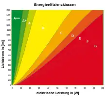 діаграму праворуч) було заборонено. Спочатку заборонено було лампи з максимумом 950 люменів світлового потоку, що відповідає 75 ватній лампі розжарювання, а також деяких видів, таких як рефлекторні стандартні R63, R80 та інше. Ця межа відповідно, знизилася до першого вересня з наступних років — 725 лм / 60 Вт і 450 лм /40 Вт ; станом на вересень 2012 року, правило виключення стало діяти у цілому.