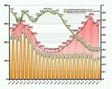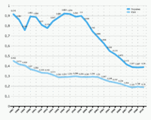 | Світ[2][3] | 0,370 | 0,355 | 0,334 | 0,332 | 0,313 | 0,289 | 0,291 | 0,295 | 0,299 | 0,293 | 0,291 | 0,296 | 0,290 | 0,267 | 0,248 | 0,237 | 0,224 | 0,204 | 0,188 | 0,196 | 0,190 |