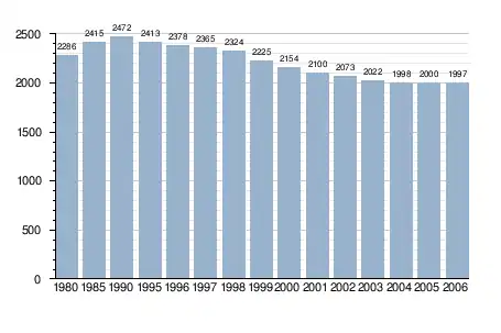 | 1970 | 1975 | 1980 | 1985 | 1990 | 1995 | 1998 | 2000 | 2002 | 2004 | 2006 | 2008 | 2010 | 2011 |