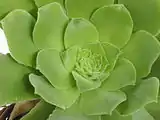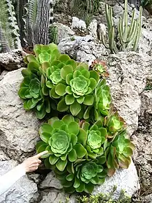 - hen and chicks aeonium («еоніум курка і курчата») — вказує на тип поновлення вегетативних частин рослини, коли нові розетки утворюються навколо старої відмираючої.