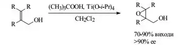 Каталізоване сполуками титану асиметричне епоксидування алілових спиртів з високим ступенем енантіомерної чистоти з передбачуваною стереохімією, використовуючи титан алкоксид, оптично активний тартратний естер та алкіл гідропероксид.