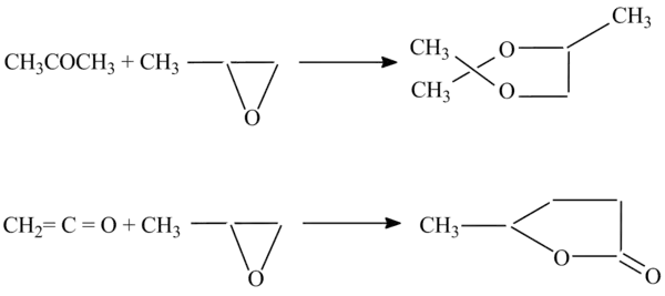 З альдегідами і кетонами епоксипропан утворює циклічні ацеталі, з кетенами γ-лактони, наприклад[1]: