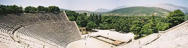 Епідаврський театр був створений архітектором Поліклетом Молодшим у 4 столітті до нашої ери. Початкові 34 ряди були поширені у добу Римської імперії ще на 21 ряд. Традиційно для усіх грецьких театрів (на відміну від римських) вид на пишний пейзаж поза скеною був невід'ємною частиною театру як такого і ніколи не залишався у тіні. Театр в Епідаврі вміщував до 15 000 глядачів.