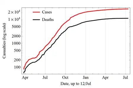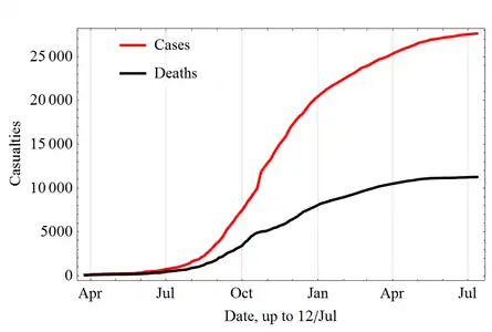 Еволюція загальної кількості випадків захворювання (cases) та смертей (deaths).