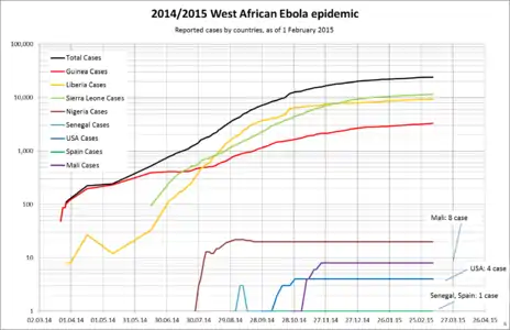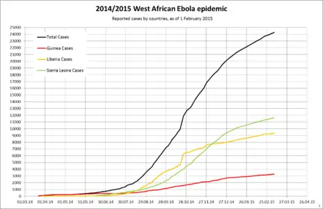 Таблиця нижче демонструє графік спалаху епідемії, який був створений на основі даних, зібраних Центрами контролю над захворюваннями[97] та ВООЗ.[91] Всі числа зіставляються із даними Управління з координації гуманітарних питань ООН (Office for the Coordination of Humanitarian Affairs, OCHA), якщо ці дані були в наявності для окремої дати.[98] До таблиці входять також випадки, які не були ще підтверджені на момент виходу доповіді. Всі дані походять із офіційних доповідей із міністерств охорони здоров'я країн, вражених інфекцією Ебола. Представництво ВООЗ стверджує про те, що числа, які повідомляються, «вельми недооцінюють масштаби спалаху хвороби».[99] Випадки у віддалених місцевостях взагалі могли бути не враховані.[100]