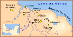 Трес-Сапотес, один з найбільших ольмекських археологічних пам'яток, продовжував існувати за епіольмеків. В часи епіольмеків найбільшими поселеннями були Трес-Сапотес та Серра де-лас-Месас, менш важливими — Ель-Месон, Лердо-де-Техада, Ла-Мохарра, Бесубаан, Чуніан-де-Абахо.