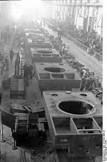 | Ервін Адерс праворуч, з членами Логістичного відділення, під час відвідин виробничих ліній Тигр І | |