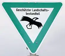 - Навколо та в межах міста розташована велика кількість природоохоронних територій. Знак, що попереджує про початок природоохоронної території (див. малюнок справа) — це трикутник, орієнтований вершиною вниз, обведений зеленою смугою та з чорним контуром орла на білому фоні.