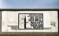 Цитата Фріда на Берлінському мурі (малюнок Елізи Будінської). Напис означає: «Хто хоче, аби світ залишився таким, яким він є, той не хоче, аби світ залишився взагалі.»