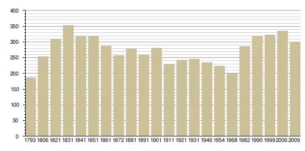 Динаміка населення (base Cassini de l'EHESS pour les nombres retenus jusque 1962[3], base Insee à partir de 1968 (population sans doubles comptes puis population municipale à partir de 2006)[4] · [5] ):