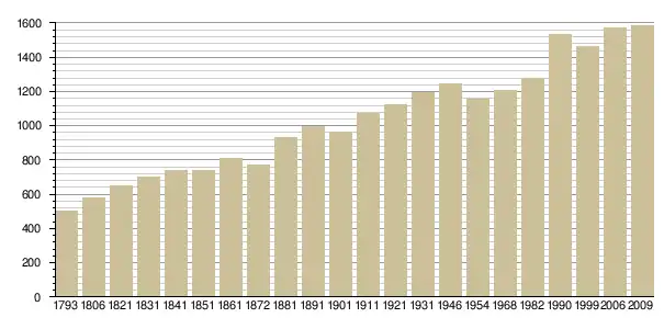 Динаміка населення (base Cassini de l'EHESS pour les nombres retenus jusque 1962[3], base Insee à partir de 1968 (population sans doubles comptes puis population municipale à partir de 2006)[4] · [5] ):