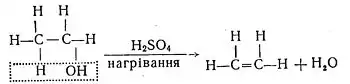 Під час реакції від молекули спирту віднімаються елементи води, а звільнені дві валентності насичують одна одну з утворенням подвійного зв'язку між атомами вуглецю. Для промислових цілей етилен одержують у великих кількостях з газів крекінгу нафти.