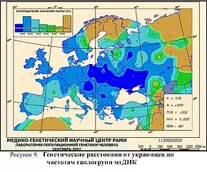 - На збірній карті 1 показано генетичну спорідненість українців та мешканців сусідніх з Україною областей за частотами гаплогруп Y хромосоми. Території, населення яких генетично близьке до українців, зафарбовані синім кольором. Максимальна генетична відмінність від українців показана коричневим кольором. Червоними точками показані популяції, за якими побудована карта. N — сумарна кількість індивідів, MIN, MAX і MEAN — мінімальне, максимальне і середнє значення відстаней для всієї карти.