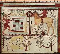 Одна з перших фресок з'явилася в гробниці Биків (540–530 роки до н. е.). Тут розписана одна стіна навпроти входу. Під фронтоном зображення двох биків, також поміщені еротичні сцени. На головній панелі сцена з грецького епосу — Ахілл чекає в засідці сина царя Трої Пріама.
