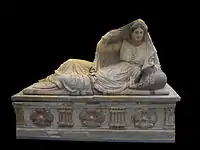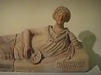 Найбільш оригінальне створення етруської скульптури — саркофаги, зазвичай теракотові. Кришка урни зображується у вигляді ложа для сімпосія, на ній зображувалася напівлежача фігура покійного, часто разом з дружиною. Фігури, особливо особи, мають велику портретну схожість. Ця схожість поступово стає все більш натуралістичною і відверто нескромною. Фізичні недоліки, риси хвороби або старості — зображуються без прикрас, однак і без типового для елліністичного натуралізму інтересу до курйозного[1].
