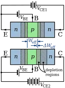 Вгорі - ширина бази npn при низькій напрузі колектор-база; Внизу - при високій напрузі. Заштриховані збіднені зони.