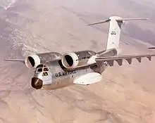Boeing C-14 (YC-14) вперше піднявся у повітря 9 серпня 1976 року і одразу продемонстрував чудові льотні характеристики. У конструкції використовувалось обдування верхньої поверхні крила реактивним струменем двох двигунів, встановлених на крилі в гондолах, значно висунутих вперед від передньої крайки крила. При відхилених передкрилках і закрилках коандівського типу вихлопний струмінь безвідривно обтікаючи верхню поверхню крила і закрилка, відхиляється вниз, тим самим збільшуючи підіймальну силу.