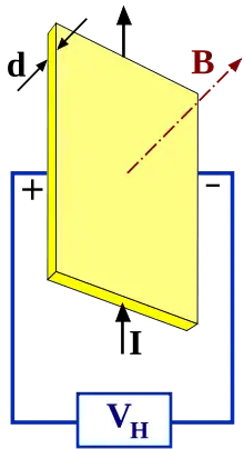 У найпростішому розгляді ефект Холла має такий вигляд. Нехай через металевий брусок у слабкому магнітному полі протікає електричний струм під дією напруженості . Магнітне поле буде відхиляти носії заряду (для визначеності електрони) від їхнього руху вздовж або проти електричного поля до однієї з граней бруса.