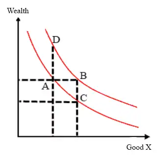 Ханеман[13] запропонувавнеокласичне пояснення ефекту володіння без використання теорії перспектив. Малюнок 2 демонструє це пояснення у графічній формі. На малюнку наведені дві криві байдужості для певного товару X та багатства. Людину питають скільки вона готова була б сплатити для того, щоб переміститись з точки A, де вона має X0 товару X до точки B, де вона має те саме багатство та X1 товару X; її готовність сплатити виражається вертикальною відстанню між C та B, оскільки людині все одно, чи вона в точці A або C. З іншого боку, людину просять зазначити, скільки вона готова прийняти для переміщення з точки B в точку A; в цьому випадку її готовність прийняти позначається вертикальною відстанню від точки A до D, оскільки їй все одно, чи вона в точці B або D. Шогрен з колегами[14] повідомив про дослідження, які підтримують гіпотезу Ханемана.