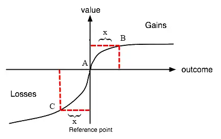 Відповідно до теорій орієнтир-залежності, спочатку оцінюють потенційну зміну як питання набуття чи втрати. Відповідно до теорії перспектив (Тверські та Канеман, 1979[12]), зміни, яка визначені як втрати, важать більше ніж зміни-набутки. Тому коли людину, яка володіє кількістю «A» товару, питають скільки вона готова сплатити за кількість «B» товару, готова сплатити менше, ніж те, скільки вона готова отримати за продаж кількості (B-A) товару; функція цінності уявної вигоди має менший кут ніж функція цінності уявних втрат.