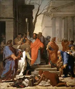 Спочатку, згідно з книгою Дії Апостолів, Павло відвідував єврейську синагогу в Ефесі, але через три місяці він засмутився впертістю або жорстокосердістю деяких євреїв і переніс своє навчання до школи Тира́на, який, імовірно, був наверненим вчителем риторики або філософії.[7][8] Вважається, що невір'я "декого" (грец. τινες) свідчить, що інші, ймовірно у великій кількості, увірували, а тому в Ефесі повинна була бути єврейська християнська громада[9].