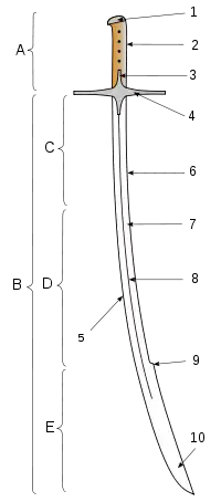9 — молоток (елмань) — збільшує міцність передньої — робочої — частини клинка.