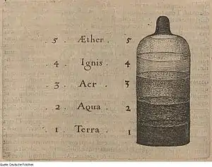 Емпедокл створив вчення про чотири стихії (елементи) — воду, землю, вогонь і повітря. Аристотель додав до них найтоншу п'яту стихію, п'ятий елемент — ефір, який він протиставляв іншим чотирьом. Чотири стихії, з яких складається весь підмісячний світ, здійснюють рух по вертикалі і горизонталі і можуть перетворюватися один в одного. Небесні тіла, які знаходяться в сферах космосу на рівні Місяця і вище (надмісячний світ), складаються з ефіру, який вічний, не переходить в інші стихії та здійснює кругові рухи.