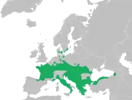 Ареал цього європейського виду охоплює простір від північної Франції та півдня Швеції на захід до північного сходу Іспанії, на півдні захоплює практично увесь Балканський та більшу частину Апеннінського півостровів (немає на Сардинії та Сицилії), на сході ареал обмежений Карпатами, Молдовою та сусідніми з нею західними районами України. Трапляється на крайньому північному заході Туреччини.