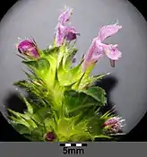 Однорічна трав'яниста рослина 30–50(70) см заввишки. Стебла розгалужені, 4-куті, кути пурпурні й рясно волохаті, зазвичай верхня частина також з залозистими волосками, головка залозистих волосків червона. Листки розташовані навпроти, черешкові. Листова пластина яйцеподібна, кінчик часто довгий. Суцвіття нижньої частини з довгими щілинами, верхня частина щільніша, колосоподібна, утворена щільними пахвовими кільцями. Чашечка дзвоноподібна 5-лопатева, часточки жорсткі, гострі. Тичинок 4, з яких 2 короткі і 2 довгі. Віночок зигоморфний, світло-пурпурно-червоний, зрідка білий, 15–20 мм завдовжки, зрощений, довготрубковий, волосистий. Середня лопать нижньої губи без виїмки на кінці, з малюнком тільки біля основи. Плід — 4-дольний схизокарпій. Мерикарпії еліптичні, злегка сплющені, майже глянцеві, коричневі[2][3].