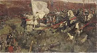 Жа́нна д'Арк (фр. Jeanne d'Arc, старофр. Jehanne[8]; приблизно 1412 — 30 травня 1431), прізвисько — Орлеанська діва (фр. la Pucelle d'Orléans)[9] — вважається національною героїнею Франції за її роль під час Ланкастерської фази Столітньої війни, і була канонізована як католицька свята. Народилася в селянській родині в Домремі-ла-Пюсель на північному сході Франції. Жанна стверджувала, що бачила видіння від архангела Михаїла, Святої Маргарити та святої Катерини Александрійської, що вказували їй підтримати Карла VII та звільнити Францію від англійського панування наприкінці Столітньої війни. На той час, непомазаний король Карл VII відправив Жанну в облогу Орлеана в складі армії допомоги. Вона набула народної популярності після успішного зняття облоги лише за дев'ять днів. Кілька додаткових швидких перемог призвели до коронації Карла VII в Реймсі. Ця довгоочікувана подія підняла французький моральний дух і відкрила шлях до остаточної перемоги французів під Кастійоном у 1453 році.